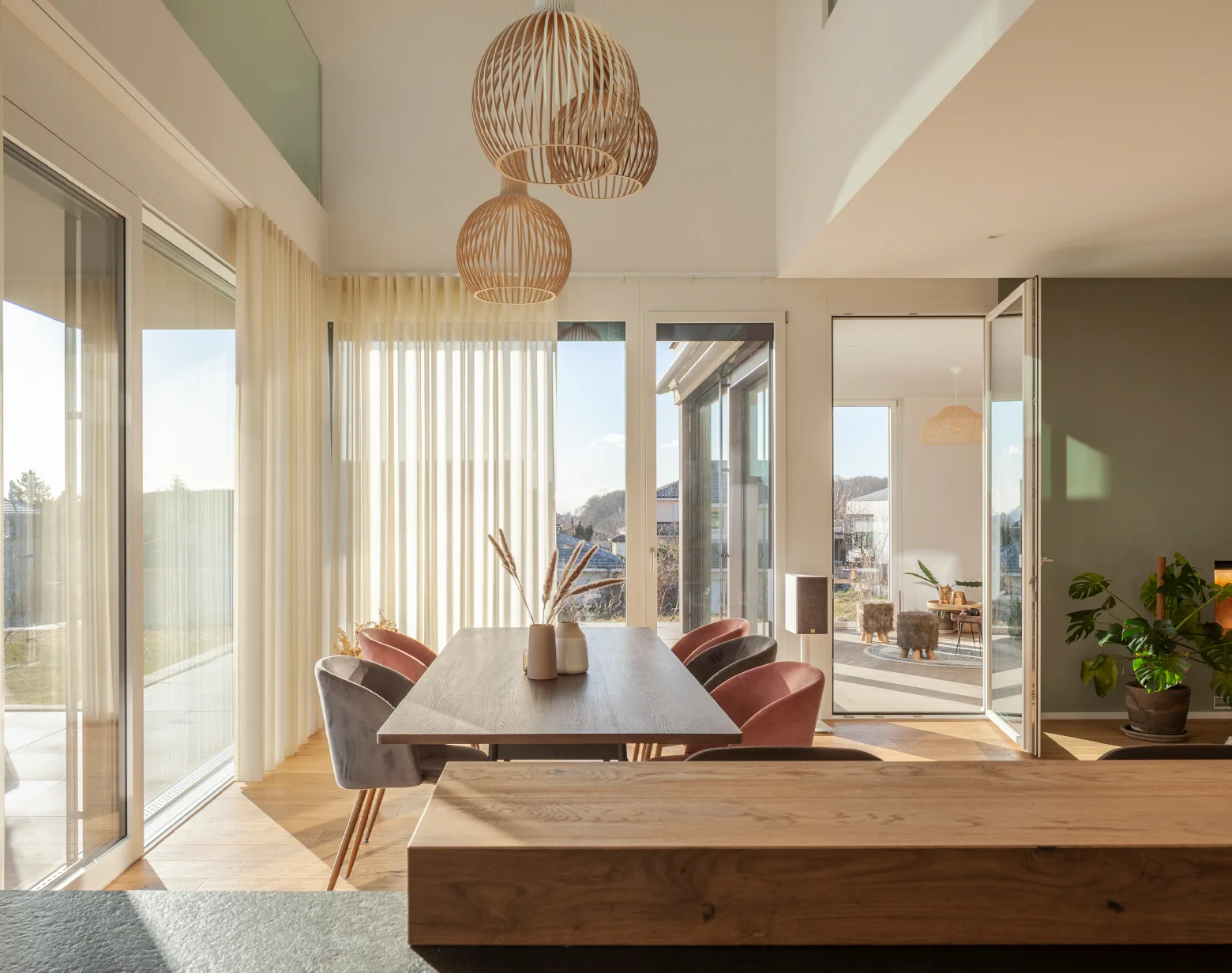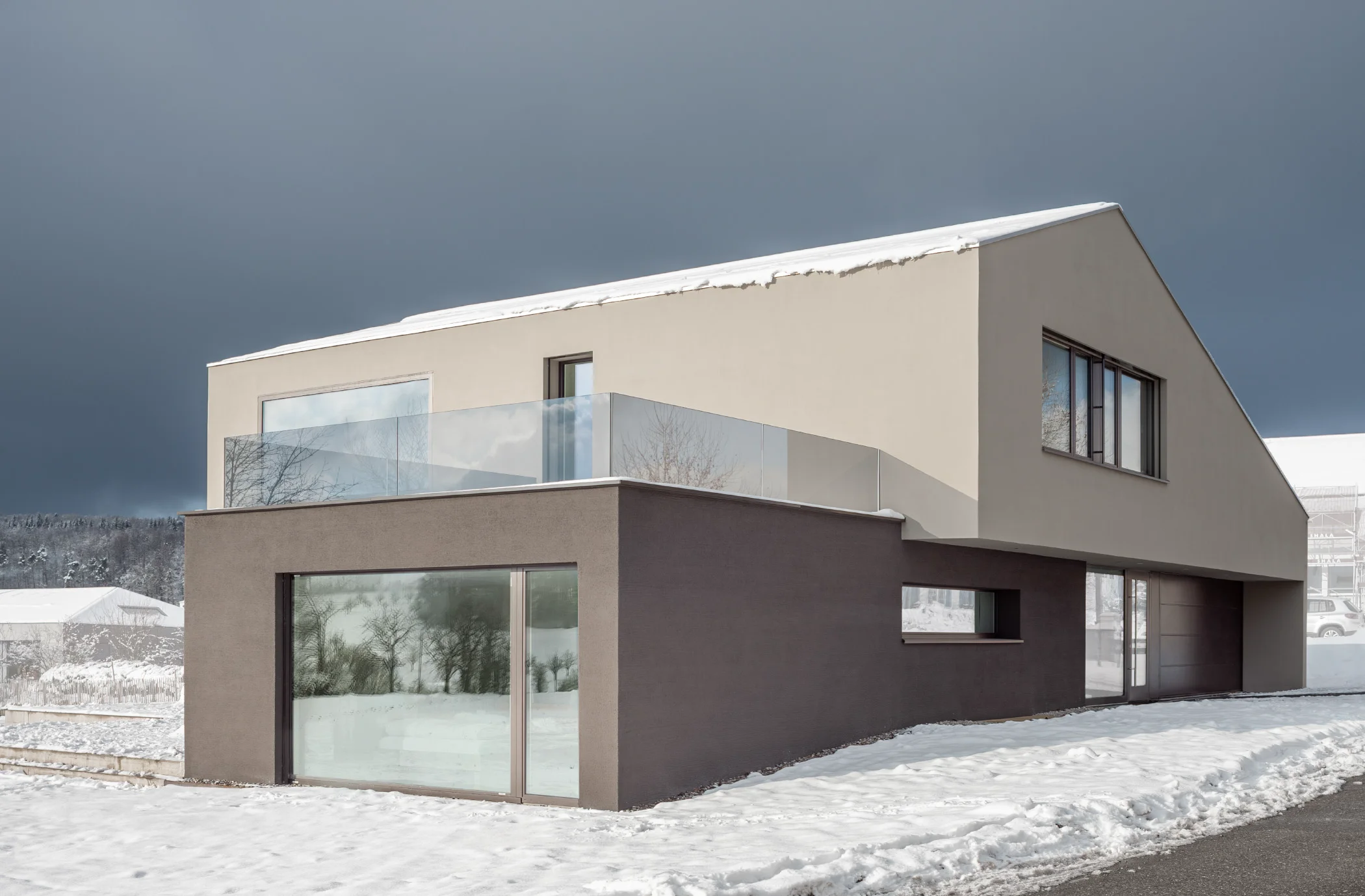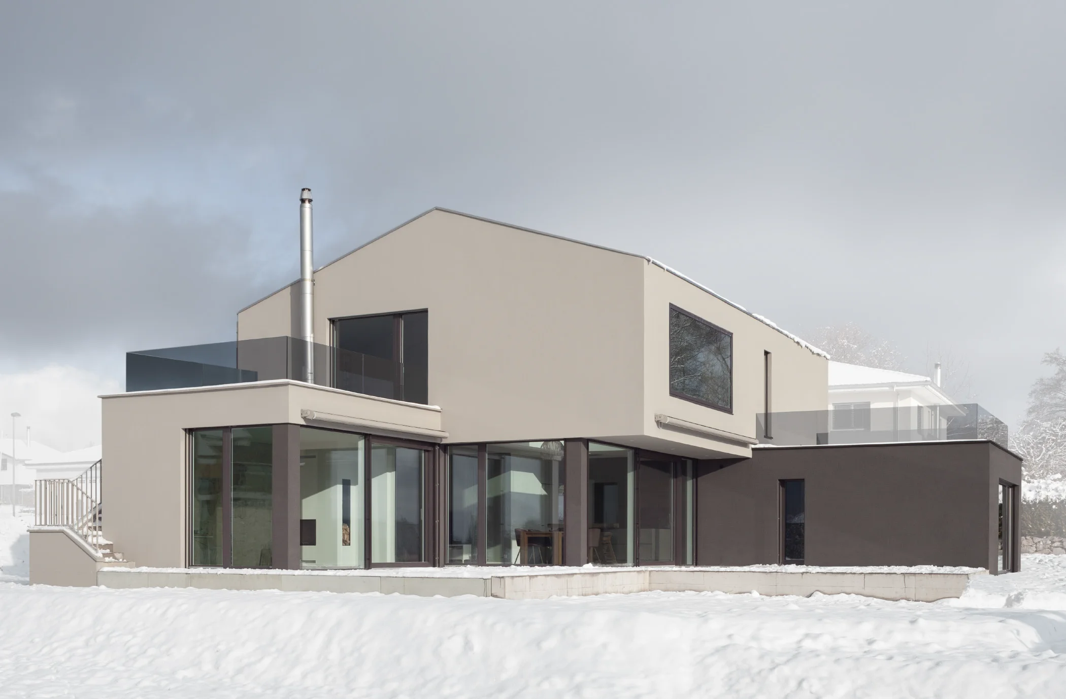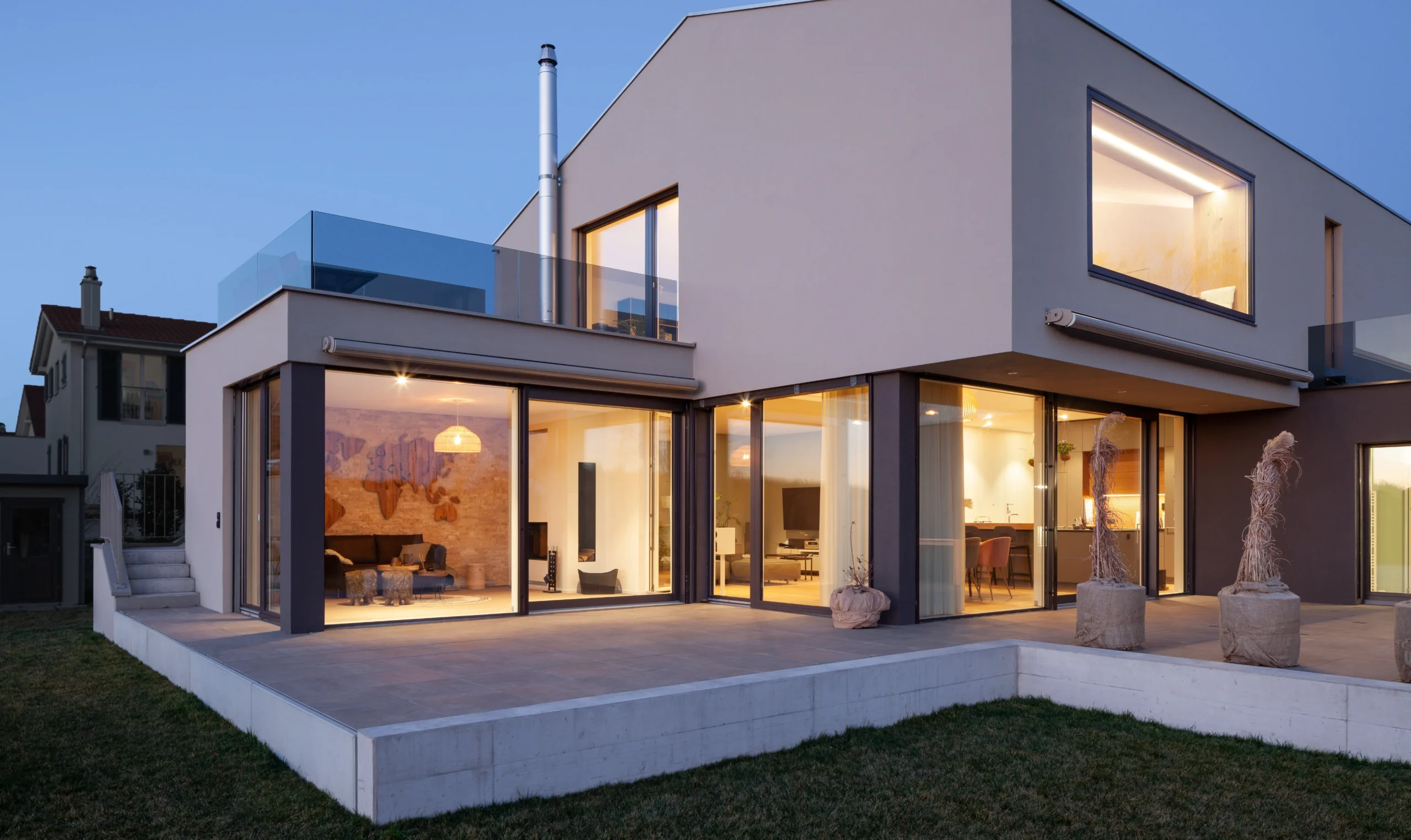 Die Architektur und die Material- und Farbgestaltung wurden so gewählt, dass ein aussergewöhnliches Familienhaus entstand, welches ruhig und grosszügig wirkt. Die verschiedenen Dachausschnitte und die grossen Fenster sorgen für helle, lichtdurchflutete Räume und sorgen für Wohlbefinden. Die spannende Raumabfolge, der grosszügige Sitzplatz und die schöne Terrasse hin zum grossen Garten lassen keine Wünsche offen.