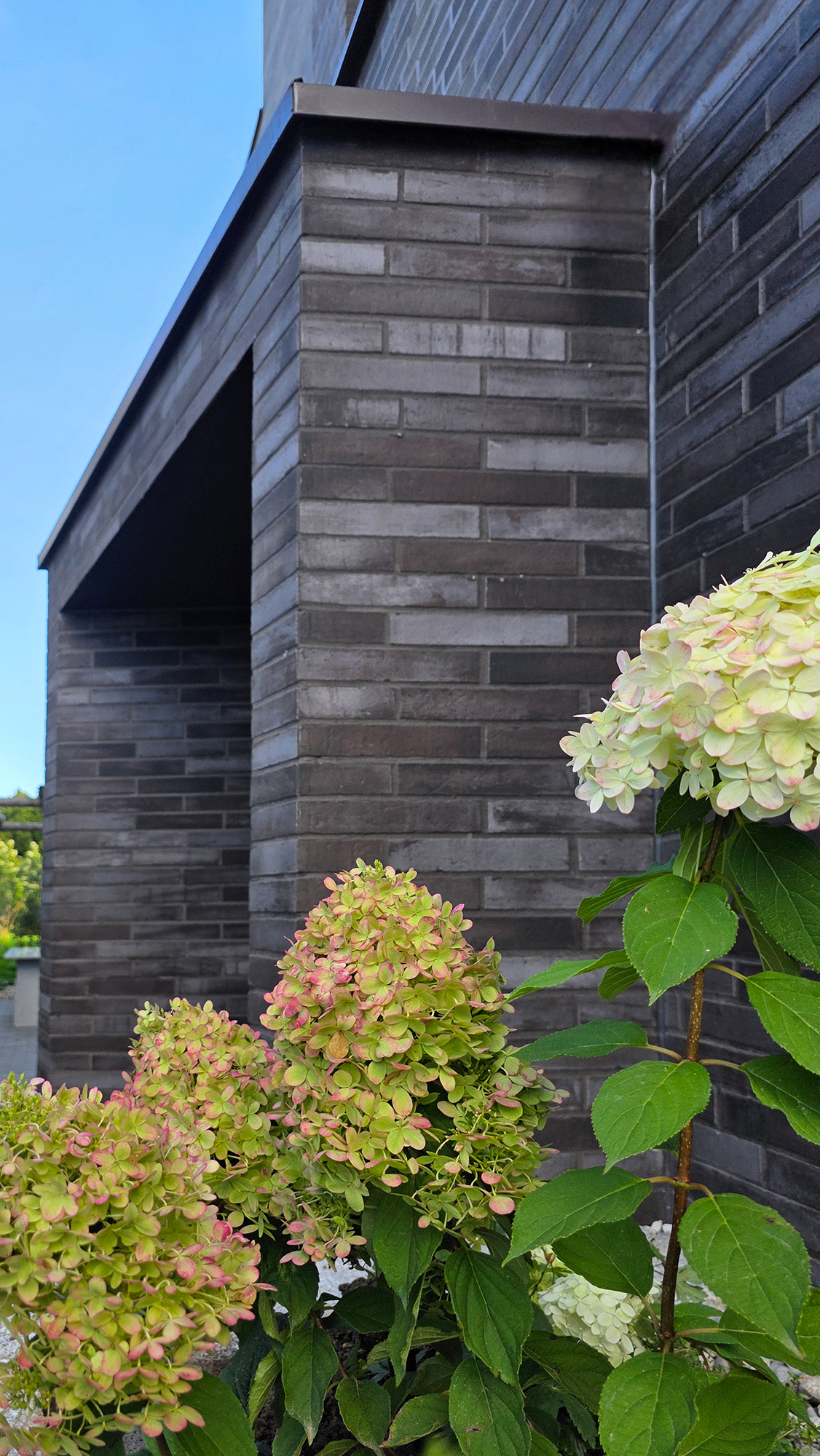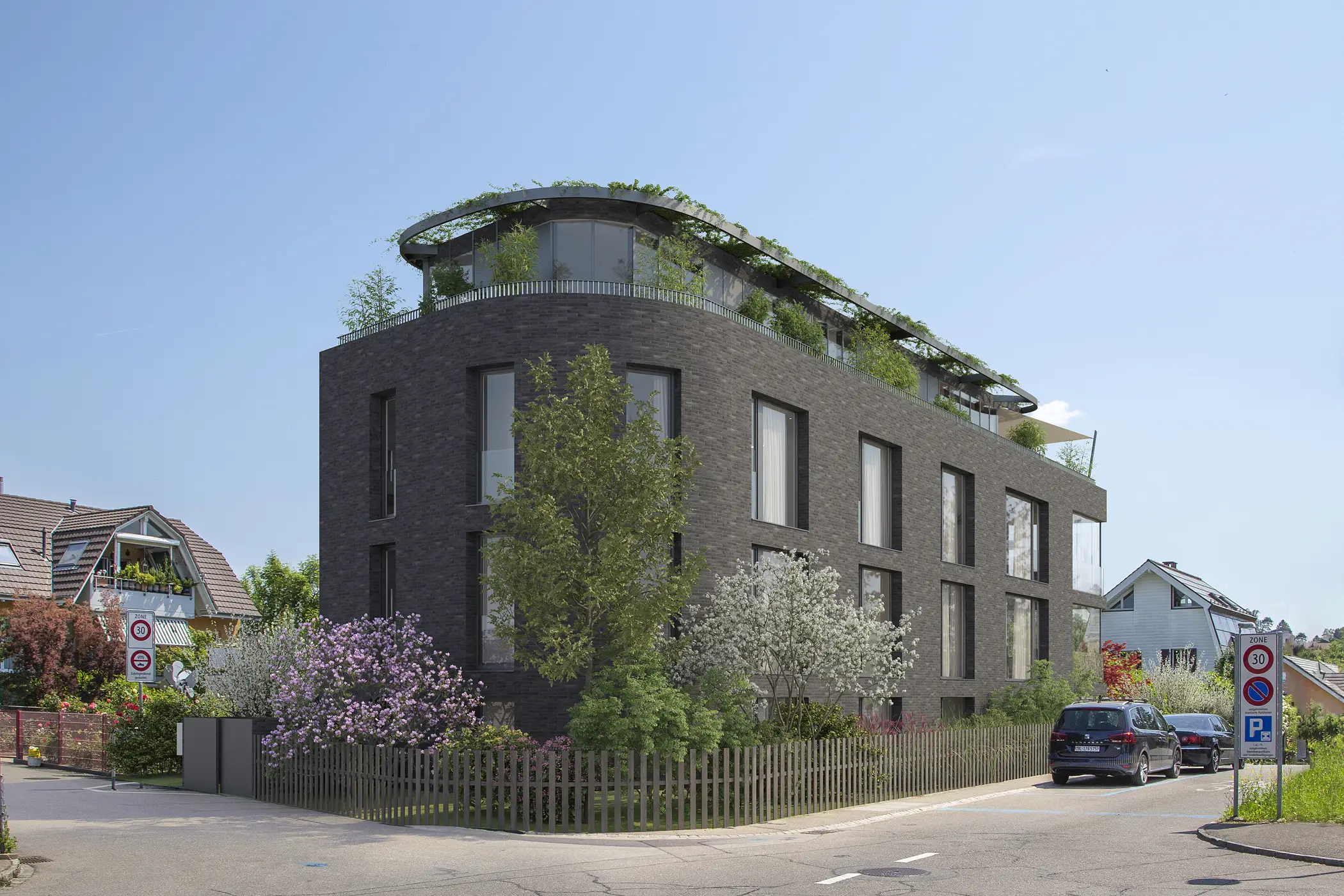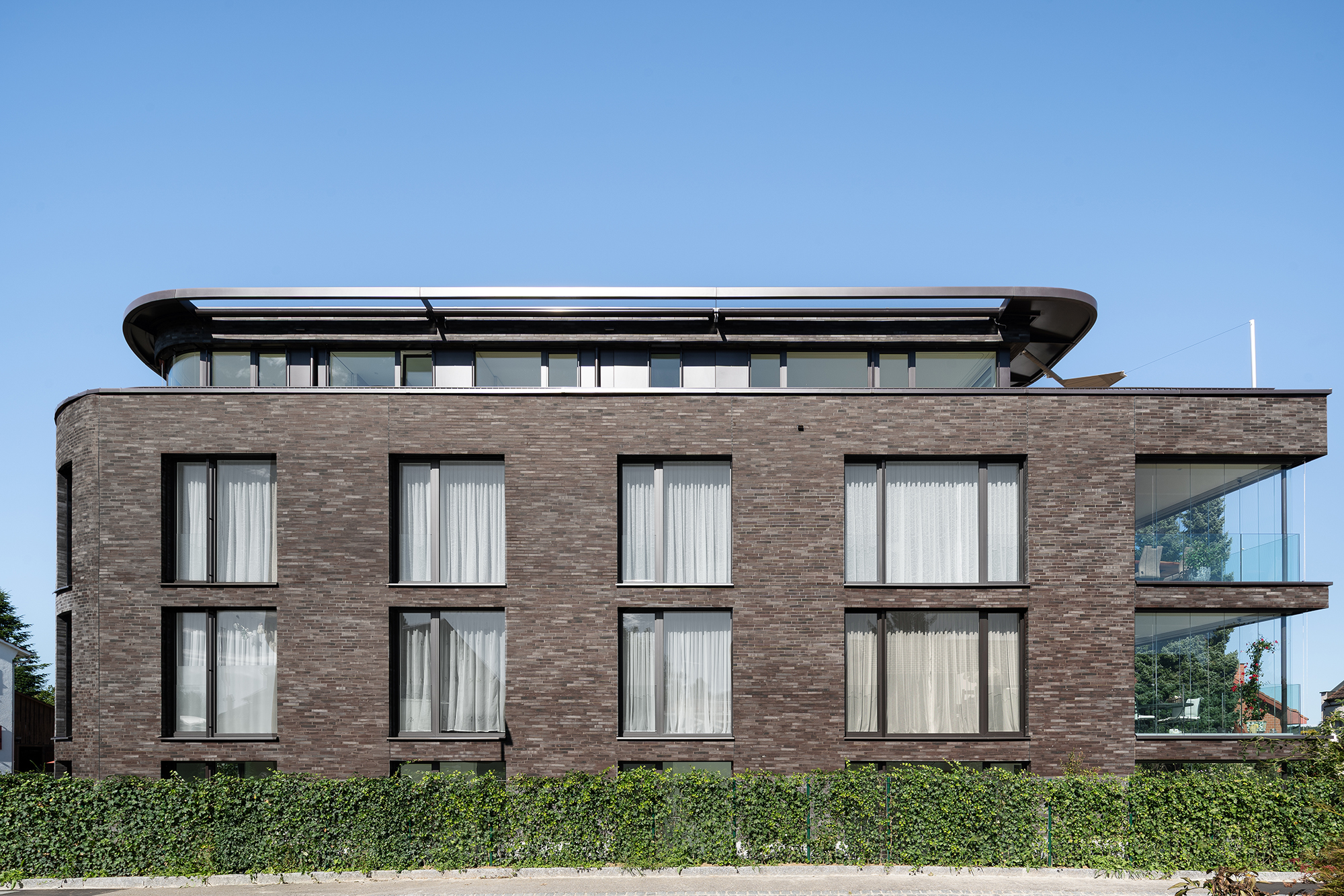 Die Architektur des langgestreckten Baukörpers, materialisiert mit einem edlen, dunklen Klinker, bildet den Schlussstein zu einem ruhigen Wohnquartier mit grossen Gärten. Die Gesamtwirkung des Gebäudes ist warm und hochwertig – mit aufeinander abgestimmten Farben.