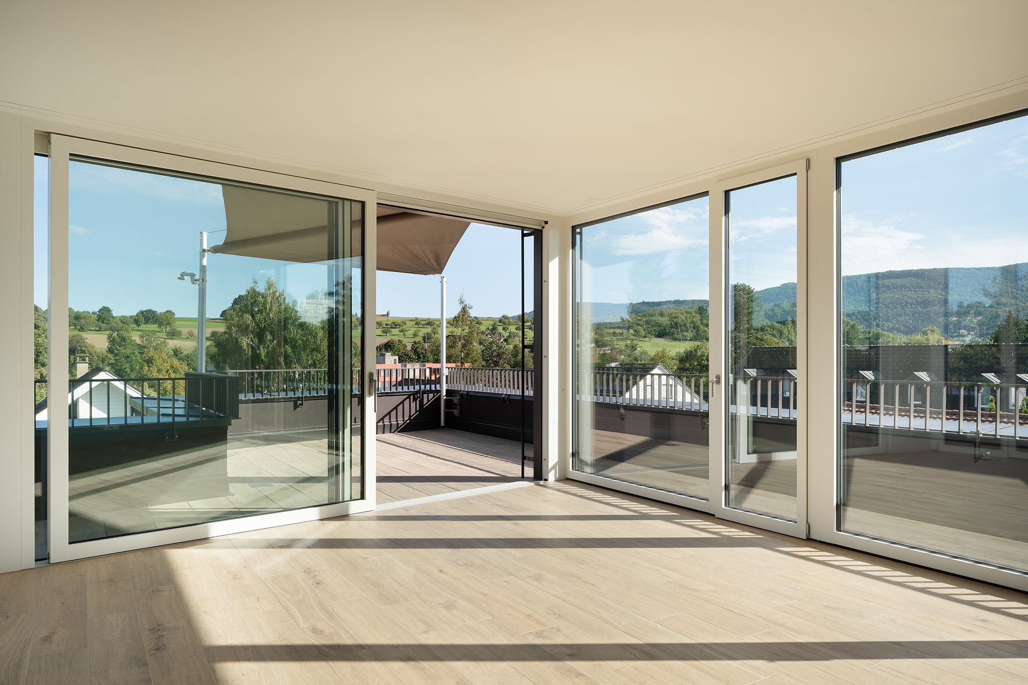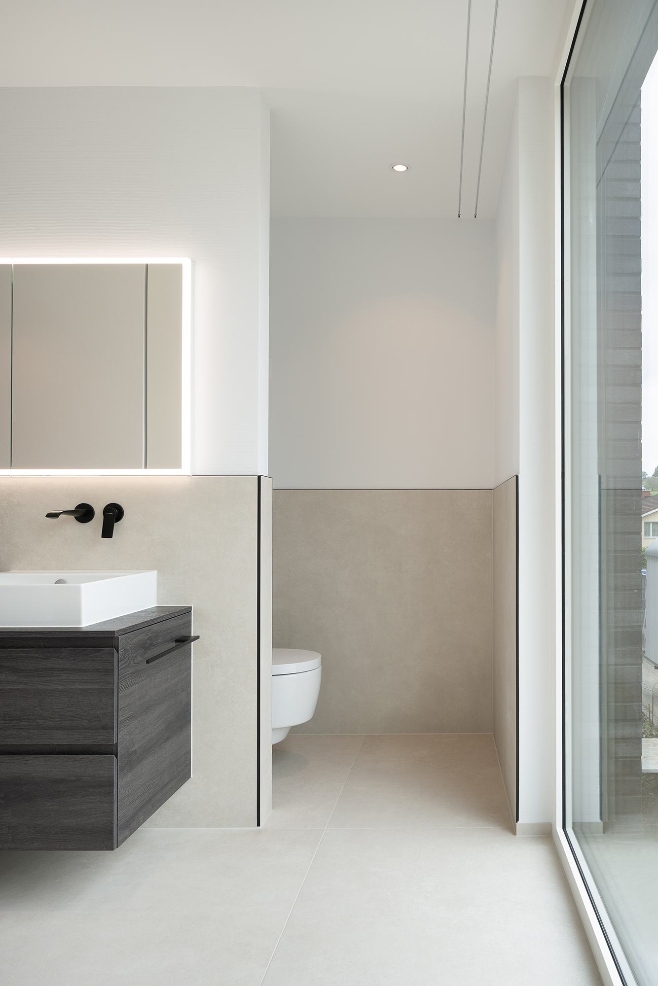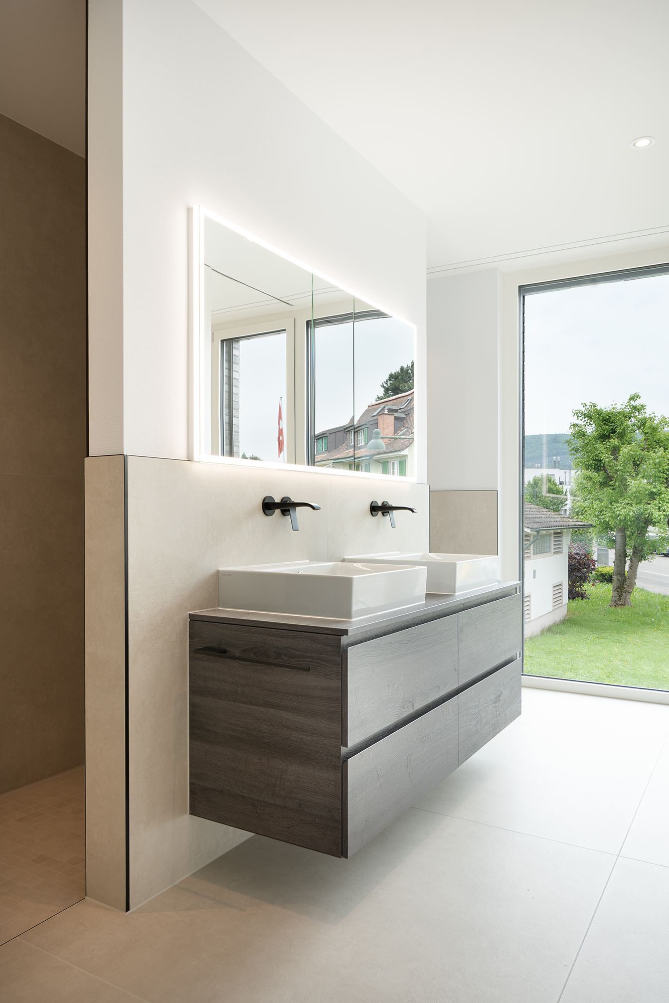 Die Architektur des langgestreckten Baukörpers, materialisiert mit einem edlen, dunklen Klinker, bildet den Schlussstein zu einem ruhigen Wohnquartier mit grossen Gärten. Die Gesamtwirkung des Gebäudes ist warm und hochwertig – mit aufeinander abgestimmten Farben.